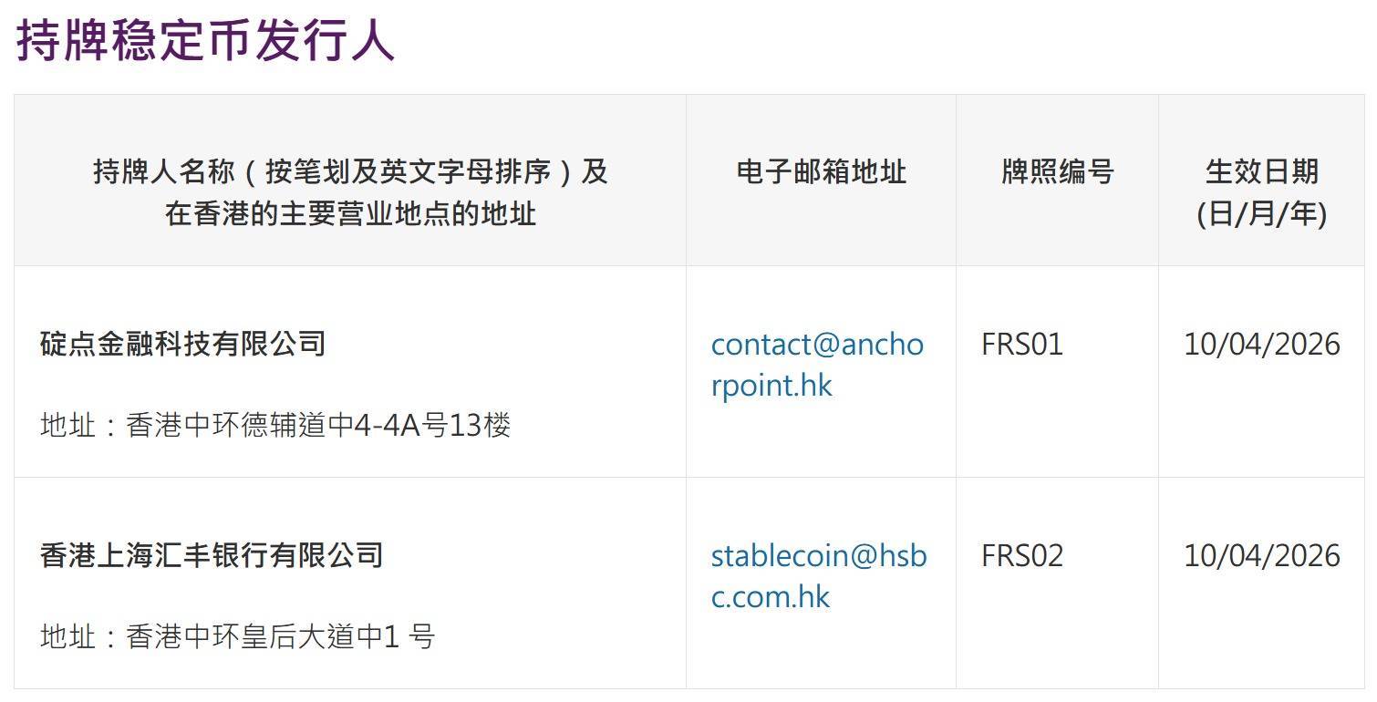 4月10日下午,香港金管局正式宣布,金融管理专员根据《稳定币条例》向碇点金融科技有限公司(渣打合资公司)及香港上海汇丰银行有限公司授予稳定币发行人牌照,以在香港发行稳定币。牌照于当日生效。